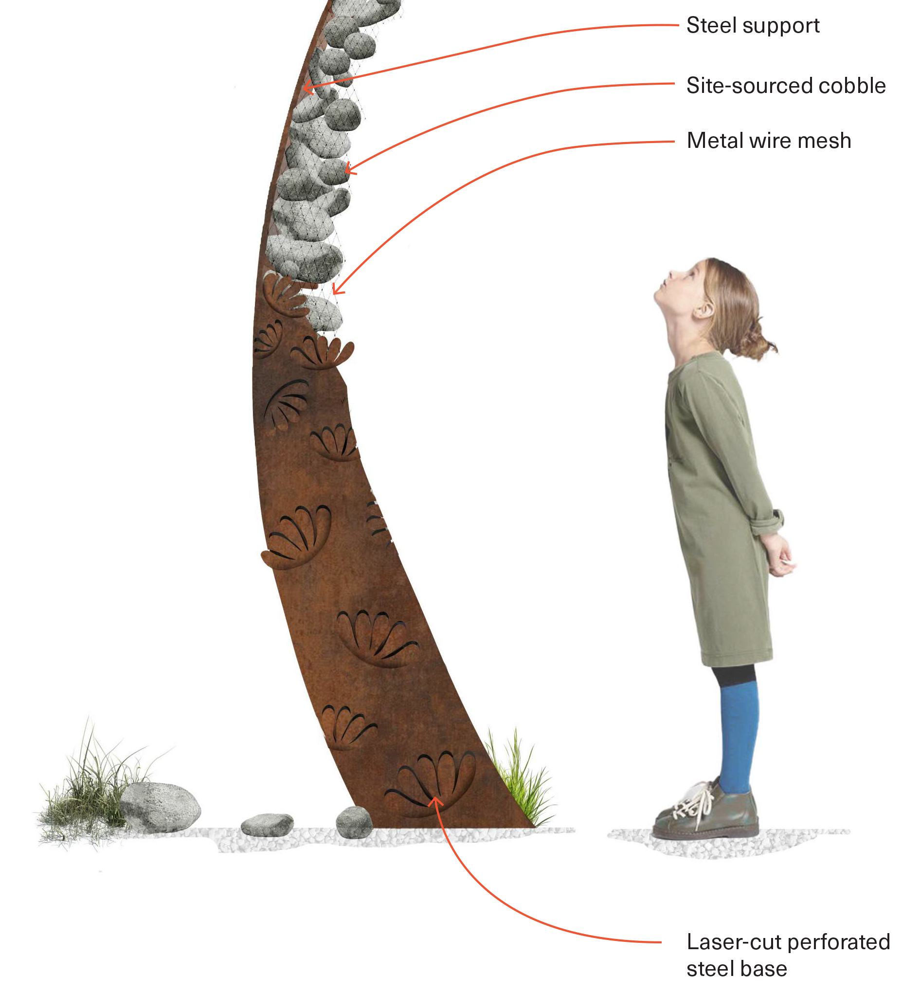 This project is an architectural composition of site-sourced elements, forming a portal to a new world. Deriving inspiration from the occult and the site vernacular, the gate thrusts upward to form an arch of steel and cobble. The steel is perforated with patterning meant to signify the natural state of play and creativity that exists within children, and the gateway form is light and ornamental, floating in space, inviting visitors to pass through.
